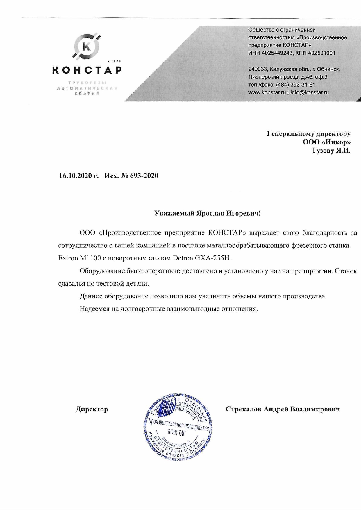 В связи с расширением производственных мощностей, наша компания приобрела у вас фрезерный обрабатывающий центр Extron M1100.